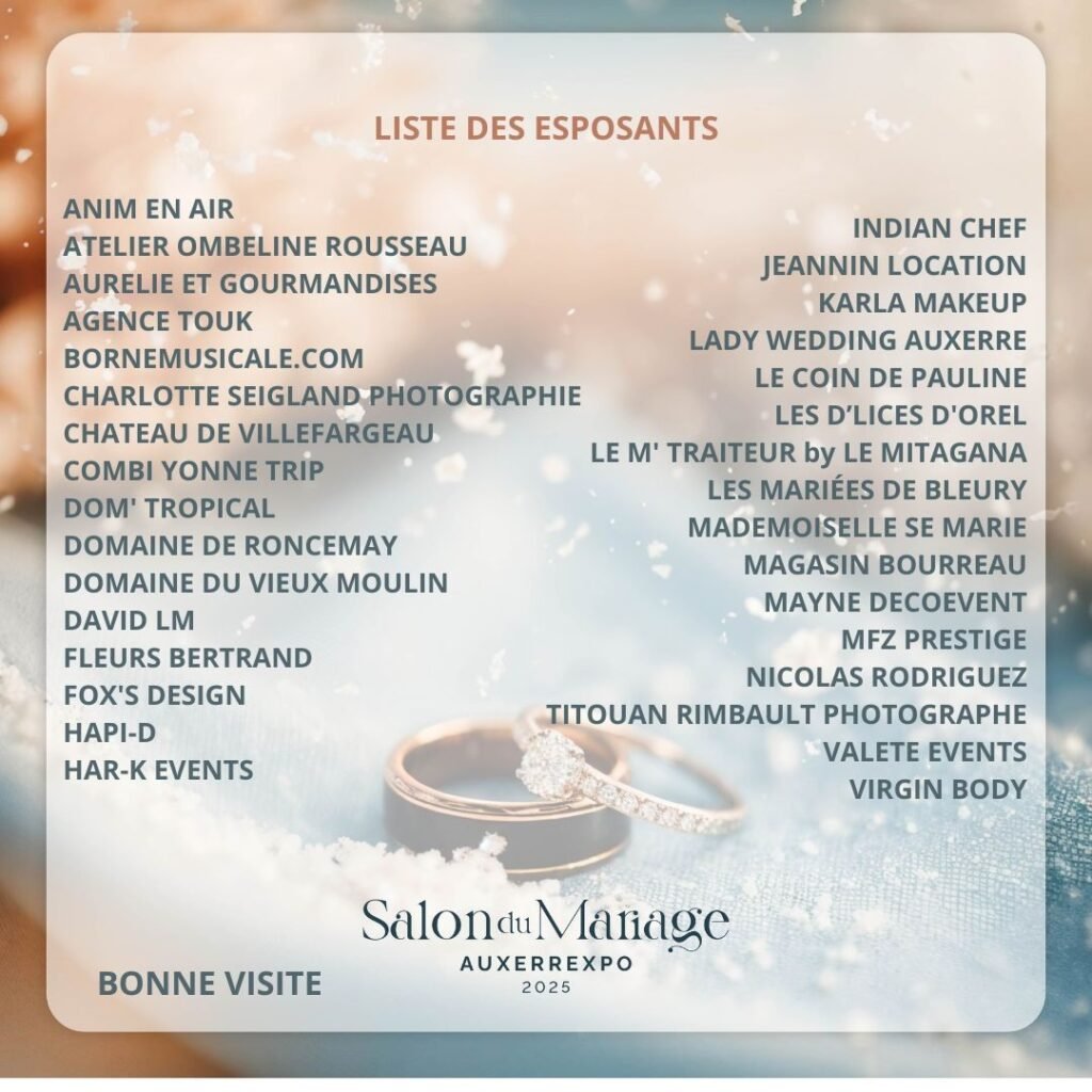 Pour vous aider à organiser votre cérémonie, des professionnels se réunissent le temps d’un week-end pour vous conseiller, vous orienter et pour que ce jour reste à jamais gravé dans votre mémoire.